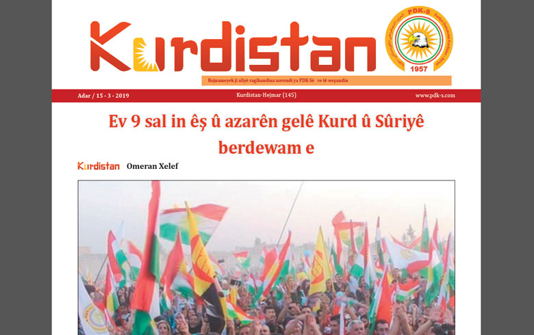 Rojnameya Kurdistan - 145 - Kurdi Mar 15 2019 Rojnameya Kurdistan - 145 - Kurdi Li vir bixwînin ku bêtir bixwînin Related Topics 32 sal bi ser şehîdbûna Pêşmerge Elî Omer Xelîl re derbas dibin Efrîn.. Dezgeha Xêrxwaziya Barzanî xizmetguzariyên pizişkî pêşkêş dike Amerîka daxwazê ji Israîl û Hizbulah dike pabendî biryarên navdewletî bibin Îraqê 175 malbatên xwe ji kampa Holê vegerand