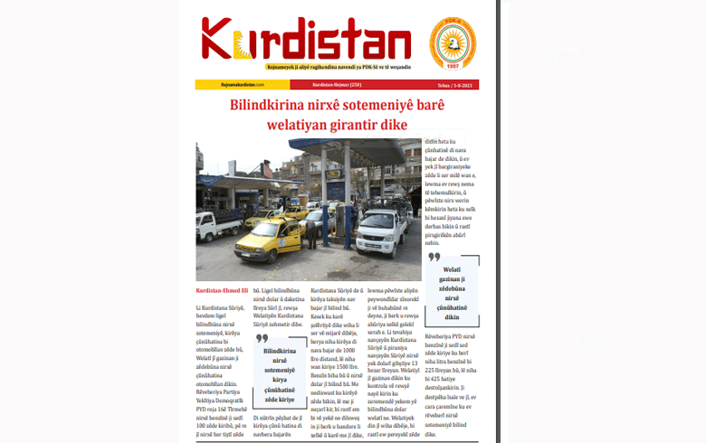 Rojnameya Kurdistan - 250 Kurdî Aug 01 2023 Hejmara nû ya Rojnameya Kurdistan - 250 beşê Kurdî derkt Li vir bixwînin ku bêtir bixwînin Download Related Topics 32 sal bi ser şehîdbûna Pêşmerge Elî Omer Xelîl re derbas dibin Efrîn.. Dezgeha Xêrxwaziya Barzanî xizmetguzariyên pizişkî pêşkêş dike Amerîka daxwazê ji Israîl û Hizbulah dike pabendî biryarên navdewletî bibin Îraqê 175 malbatên xwe ji kampa Holê vegerand
