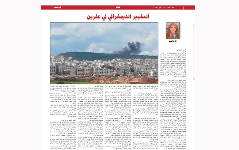 كل منطقة سورية عندما تكون ضحية لنيران المقايضات والبازارات السياسية، تكون عفرين ضحية للتغيير الديمغرافي وذلك من خلال توطين سكان تلك المناطق في عفرين.