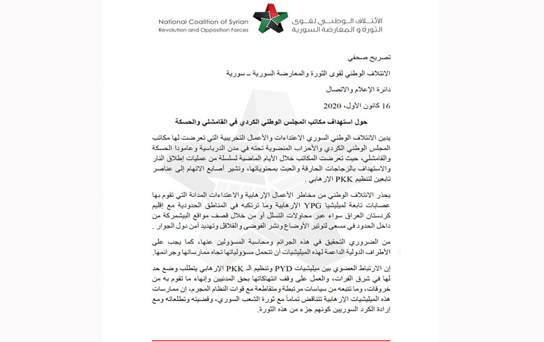 يدين الائتلاف الوطني السوري الاعتداءات والأعمال التخريبية التي تعرضت لها مكاتب المجلس الوطني الكردي والأحزاب المنضوية تحته في مدن الدرباسية وعامودا الحسكة والقامشلي، حيث تعرضت المكاتب خلال الأيام الماضية لسلسلة من عمليات إطلاق النار والاستهداف بالزجاجات الحارقة والعبث بمحتوياتها، وتشير أصابع الاتهام إلى عناصر تابعين لتنظيم PKK الإرهابي.