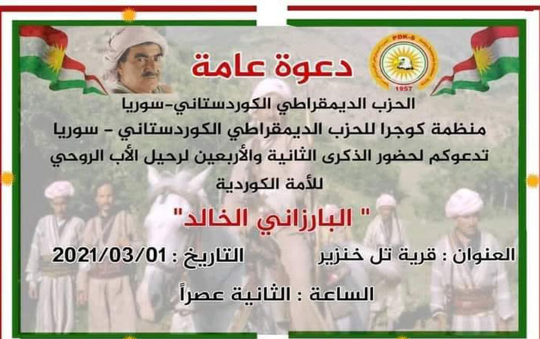 منظمة كوجرا للحزب الديمقراطي الكوردستاني – سوريا تدعوكم لحضور الذكرى الثانية والاربعين لرحيل الاب الروحي للامة الكوردية البارزاني الخالد